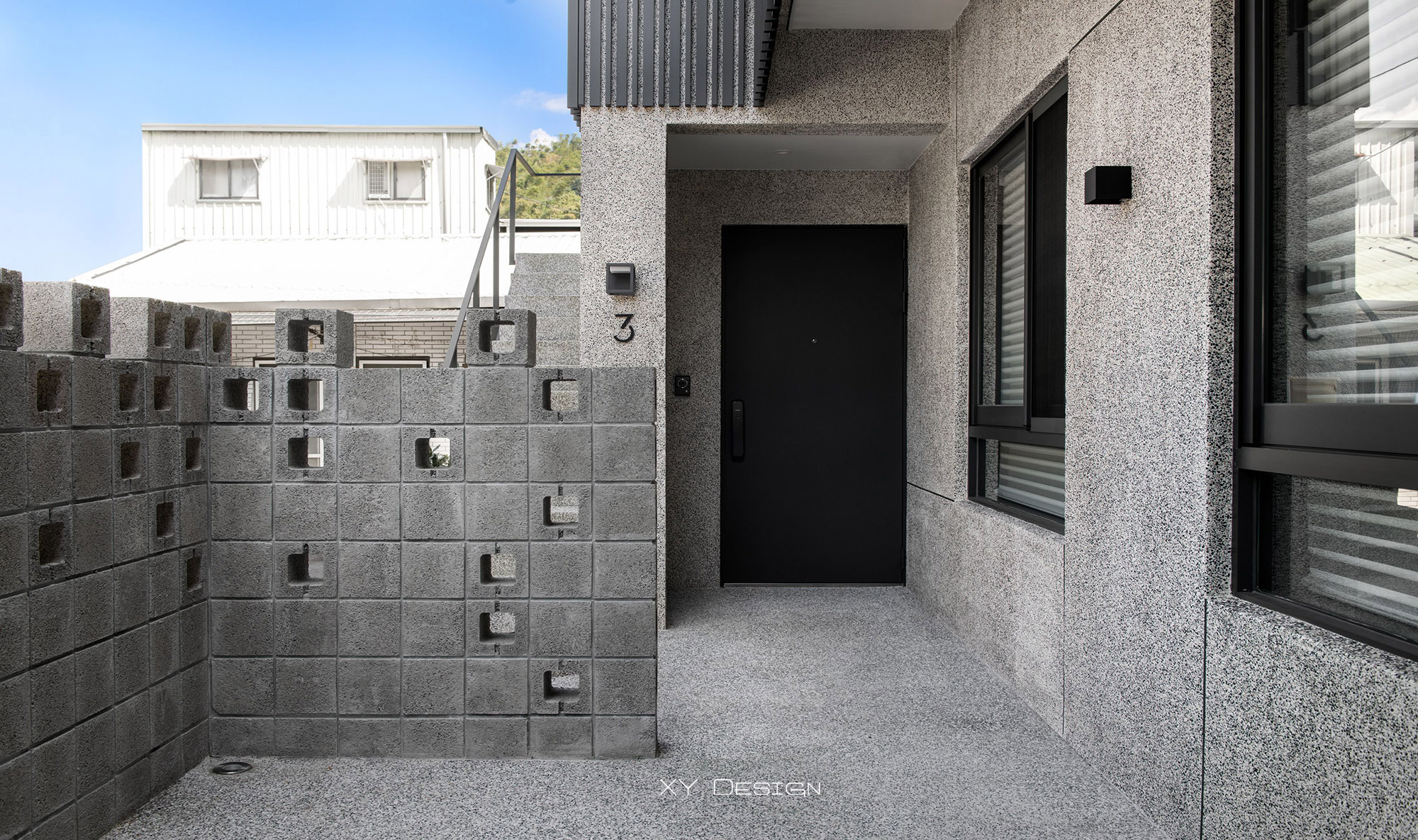 建築外觀以洗石子與穿孔磚構築立面,肌理層次與通風節奏相互呼應,在保有隱私的同時引入自然光與空氣,展現有呼吸感的建築語言。二層垂直金屬格柵延伸現代建築語彙,賦予立面節奏,同時兼具遮陽與遮蔽功能。整體灰階調性結合自然材質,使建築融合周遭街廓,呈現質樸的都市美學。